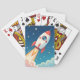 Cute red and white rocket blasting off in space with whimsical stars and clouds.