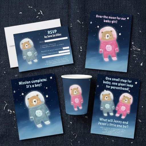 Bläddra in i föräldraskap med den här vackra rymdtematiska genderna visar partiinbjudan! Med två söta björnar i astronaut kostym, en i blått och en i rosa, flytande mot en stjärnnatt himmel. "Ett litet steg för baby, ett jättekliv för föräldraskapet" ger en roligt och ett känslodrag. Perfekt för rymdälskande blivande föräldrar och deras gäster!