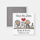 Lustigt Spara datum magneter med söt tecknad stick figurer av en brud och en groom som rostar deras bröllop! Anpassa med namn på briden och trimningen och bröllop-datumet i det utrymme som tillhandahålls.