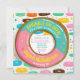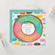 Ett portionskort med en givande donut-fest som är utformat för en donut med isbildning och sprinkler. Färg är teal, rosa, gult och annat färg. Mycket roligt, glad och söt.