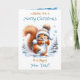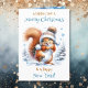 Den lilla ekorren på vintern som dansar i snö på en personlig julkort på vinterdagen.