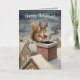 A cute little squirrel is standing on the chimney on top of a snow covered house. It is smiling, and about to drop an acorn down the chimney as a gift. This card is meant to be a subtle and adorable Christmas card, like this squirrel is trying to be Santa. It is night time, and the warm glow from the Christmas lights on the houses light the scene. It's cute, heartwarming and whimsical, and it is just meant to make your beloved smile :)