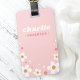 Cute bagagetaggar med vit jordgubbsbakgrund på en rosa blommar och ditt eget namn i ett retroteckensnitt.