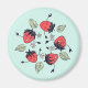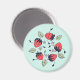 Stam jordgubbsmagnet med en vektorillustration som skildrar 5 lycklig-leende jordgubbstecken som dansar i en cirkel omgiven av löv och blommor av eget slag. Roligt med vår-anda för en person som kärlek de här yumiska frukterna.