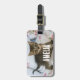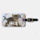 Ett bagagemärke med ett lustigt foto av tabby katt. Hair på ryggen höjdes något och han har ett överraskande uttryck på sin ansikte. Tur och förtjusande. Ljuger dig. :