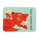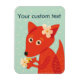 Cute Fox-magnet med en vektorillustration av en tecknad räv med stort öga och blommor på hennes huvud, som håller en massa blommor i hennes tass. Den här söta magneten har anpassade. Bilden har en glad, ljusblå orange och ljusblå färg och är helt enkelt roligt. Den har ljusblå bakgrund med nästan vit polka dots.