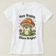Söt tecknad groda med champinjonhatt t-shirt med citatet "Skutt Lycklig, Shine Bright!" Mjuka pastel kawaii/cottagecore-konst ger lekfulla, hälsosamma vibes - perfekt för tonåringar, barn och unga vuxnor. Underbar för gåvor eller daglig bära. Köp nu.
