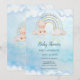 Cute baby shower invitations for baby boy featuring an adorable teddy bear, rainbow and clouds.