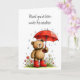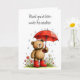 Cute teddy bear wearing red galoshes and holding a red umbrella stands in a patch of flowers in the rain. "Heard you've been under the weather." and "Hope you feel better soon." texts can be changed. This card is perfect for a family member, friend, or someone in your work placed. The charming bears make it appropriate for children, too. AI-generated images by IveyCottage.