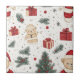 A charming Christmas pattern ceramic tile featuring adorable teddy bears dressed as Santa, festive gift boxes, decorated Christmas trees, candy canes, ornaments, and snowflakes on a white background. This cozy holiday design blends warm, hand-drawn illustrations with a playful winter feel.
