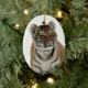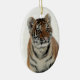 Ett foto från porträtt av en tiger unge satt i snö med en snöflinga på toppen av näsan. Julprydnad.