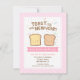 Inbjudan om dina vänner för ett nytt år firande med den här snygga pinginbjudan. Avslappnaden är handskriven som text och lyder: "Skål för nyår!" Istället för champagne och glasögon, hur är det med tost av sött leende bröd med färgstark konfetti i cirklar, stjärnor och fyrkanter som flyger i bakgrunden? Rosa och vitt lutat rand mönster i bakgrunden. Mottagarna kommer att le när de tar emot denna roligt och inbjudan till glad tecknad!