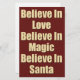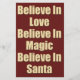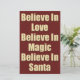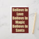 Kute jul säger om Jultomten i kräm och mörk röd text med snöflingor och röd papper bakgrund. Tro på Kärlek, tro på Magic, tro på Santa.
