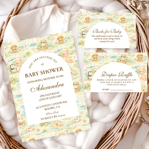 A whimsical watercolor design featuring a playful mix of pastel summer animals surrounded by tropical leaves, seashells, starfish, and soft botanical details. The cheerful palette of peach, mint, coral, and soft blue creates a light storybook atmosphere, while the elegant arch layout keeps the celebration details beautifully framed and easy to read. Perfect for a warm, joyful summer celebration with a charming nursery aesthetic.