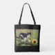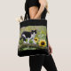 Cute tuxedo-katt på träd gren med solblommor - tygkasse