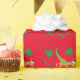 Cute Tyrannosaurus Rex och Julgranar barn Wrapping Papper. Personlig T-rex dino-presentfigursättning med eget namn på underordnad. Lustigt designat med förhistorisk dinosaurie som bär en Jultomten-hatt medan Julgranar kastas omkring. Röd bakgrund eller anpassningsbar färg. Finns i matte- och glansig rullar. Coola illustration för pojkar som är galna med jurydjur.