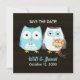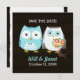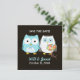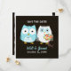 Den ljusblå uggla-brudgummen med en bockslips och finare-ruffad skjorta håller händer med sin vackra uggla brud med en färgstark blombukett. En roligt Spara det datumkort för bröllop som dina gäster kommer att sätta på visningen eftersom det är så sött. Besök Jenns Doodle World om du vill ha ännu fler planeringsprodukter och gåvor från bröllop med denna uggla-tecknad och mer roliga och söta tillkännagivanden från bröllop.