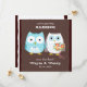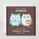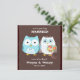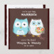 Den ljusblå uggla-brudgummen med en bockslips och finare-ruffad skjorta håller händer med sin vackra uggla brud med en färgstark blombukett. En roligt Spara det datumkort för bröllop som dina gäster kommer att sätta på visningen eftersom det är så sött. Besök Jenns Doodle World om du vill ha ännu fler planeringsprodukter och gåvor från bröllop med denna uggla-tecknad och mer roliga och söta tillkännagivanden från bröllop.