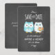 Den ljusblå uggla-brudgummen med en bockslips och finare-ruffad skjorta håller händer med sin vackra uggla brud med en färgstark blombukett. En roligt Spara det datumkort för bröllop som dina gäster kommer att sätta på visningen eftersom det är så sött. Besök Jenns Doodle World om du vill ha ännu fler planeringsprodukter och gåvor från bröllop med denna uggla-tecknad och mer roliga och söta tillkännagivanden från bröllop.