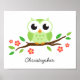 Cute wall decor med lite grönt tecknad sitta i uggla på gren med grönt löv och rödblommor. Anpassade namn. Utformning av roligten för barn. Illustration av MheaDesign. Om du vill ha några frågor om bilden eller den tryckta utformningen kontaktar du mig via min Facebook-sida: www.facebook.com/MheaDesign