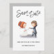 Tur och spara bröllop-meddelandet med en illustration av en flicka och en pojkdans. Illustrerad och designad av Patricia Alvarez.