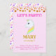Cute Unicorn Birthday bjudande. Lättt gyllene polkamhuvud, enmajs med tre färg-regnbåge och stjärna mönster på rosa bakgrund. På baksidan finns polka dots i flera färg och nummer 3 i en stjärna. Alla texter och nummer kan vara personliger.