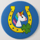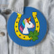 Ett exempel på en söt vit enhörn med regnbåge på en gyllene hästsko med en grönt schrock klöver löv för St. Patrick's Day. Denna vackra saga och magiska djurdesign är en presentidé för älskare och lycka till charm älskare.