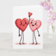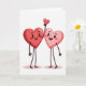 This card shows two cartoon hearts standing side by side on a plain white background. The heart on the left is a deeper red with a big smile and a soft blush on its cheeks, looking happy and calm. Next to it is a lighter pink heart that’s also smiling, with a thin dark arm lifted up. In its hand, it holds a tiny red heart like a sweet little gift. Both hearts have simple stick-like arms and legs, and their faces are easy to read and friendly. The lighting gives them a gentle shine, almost like candy, with a slight texture that keeps them from looking flat. There’s no text on the card, so the picture does all the talking ❤️