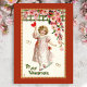 Söt liten gyllene vintage flicka i vitt och rosa frock som håller röda Alla hjärtans hjärta indränkt av att klättra i rosa ros på trellis med guld och röda gräns och Valentina hälsning.