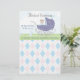 En söt nyfödd bebis-gosse keepsaké med baby i en blå vintage baby på en grasslig gräsmatta, som garnerats med blå fåglar och en blå kanin, mot en pastellkanin blå himmel med vita moln. Barnets namn i centrum med stora dekorativa bokstäver, och under och över grund i blå skrift är barnets födelsedatum och födelsetid, längd och vikt. En perfekt för nyfödd bebis-pojken. Allt detta på en blå, vit och rosa (diamantbakgrund). En underbar presentidé för nya föräldrar.