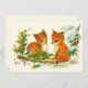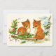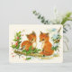 Ett platt kort med en fin teckning av ett par rävar med en vänlig fågel i närheten. Omringad av holly och gräs-koner och annan vinter-löv.