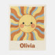This cheerful retro-style personalized blanket features a cute, kawaii, smiling sun with bold wavy rays in a groovy 70s-inspired color palette; warm orange, mustard yellow, and soft blue tones.