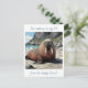 Walrus themed postcard to say hello and keep in touch with friends and family while travelling or who live long distance. A cute walrus laying on a sandy beach by the ocean on a sunny day. Background of cliffs and blue ocean waves.