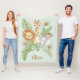 This charming, personalized blanket features four cute, friendly baby safari animals—a giraffe, a lion cub, a baby elephant, and a monkey—peeking out from a lush backdrop of soft green tropical jungle leaves and dried palm fronds. This gender-neutral, soft-toned art is ideal for jungle nursery decor orbaby shower gifts.
