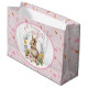 Delight in springtime sweetness with this adorable watercolor bunny nestled in a lush floral wreath — featuring soft peach peonies, yellow ranunculus, sage greenery, and delicate succulents. The central illustration is framed by a gentle pink rounded border, all set against a charming repeat background of tiny carrots, bunnies, and the words “Hi”, “Love”,Cute”, “Rabbit” in playful script on textured pink paper.