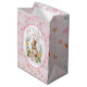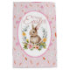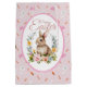 Delight in springtime sweetness with this adorable watercolor bunny nestled in a lush floral wreath — featuring soft peach peonies, yellow ranunculus, sage greenery, and delicate succulents. The central illustration is framed by a gentle pink rounded border, all set against a charming repeat background of tiny carrots, bunnies, and the words “Hi”, “Love”,Cute”, “Rabbit” in playful script on textured pink paper.