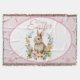 Delight in springtime sweetness with this adorable watercolor bunny nestled in a lush floral wreath — featuring soft peach peonies, yellow ranunculus, sage greenery, and delicate succulents. The central illustration is framed by a gentle pink rounded border, all set against a charming repeat background of tiny carrots, bunnies, and the words “Hi”, “Love”,Cute”, “Rabbit” in playful script on textured pink paper.