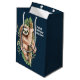Gåsväska med söt vattenfärgsdesign med en söt lutning som hänger på en träd gren omgiven av tropiska löv av grönt. Mörk blått bakgrund.