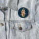 Knapp med en söt vattenfärgsdesign med en söt sluttning som hänger på en träd gren som omges av tropiska löv av grönt.Mörk blått bakgrund.