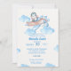 Cute Watercolor Blue Penguin Pilot Inbjudan med texturerad bakgrund, blå moln. Bakgrunden har vita stjärnor på blå bakgrund. Mamma kommer att vara kärlek... den här beundransvärda babyduschinbjudan.