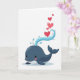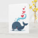 This design shows a round, deep-ocean blue whale centered on a bright white background, its smooth cartoon shape standing out clearly. The whale’s glossy black eyes, rosy cheeks, and small upturned smile give it a sweet, friendly look that feels a lot like a quiet crush 🥰. From the blowhole, a light blue stream arcs upward like a fountain, as if it’s sending a gentle message into the air. Floating in and above that stream are several red hearts in different sizes ❤️, rising toward the top of the card like little love notes. Tiny droplets in soft pink and teal scatter around the hearts, adding light touches of color without crowding the scene. There’s no written text anywhere, leaving open space above and around the whale so the hearts and water arc become the main “message.” The highest hearts cluster near the upper edge while the pale blue spray curves diagonally, with a few droplets trailing off to the sides.