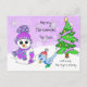 Cute Whimsical jul lila snögubbe och blå vinterhatt och vinter samt fågelutsäde med Julgran och snöflingor i personligens vykort för julkort.