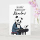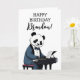 En tuxedobeständig panda som sitter på en stor piano och som fyller en födelsedagsfest.