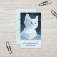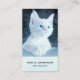 Affärskort med ett foto av en vit kort-ledd kattunge med ljusblå ögon. Startar in i avstånd.