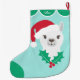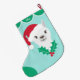 Ett vackert vitt lama bär en röd julhatt på framsidan av personligens julstrumpa. Bakom honom hänger en annan tomtehatt på en grönt cactus. På hans fötter är en lätt inlindad gåva paket. Överdelen av lagret har en grönt som skalas gräns med anpassningsbarnas text vit. En passande tapappdesign slutför framsidan. Lagerhållningens baksida har samma ljusblå bakgrund, gräns och tå, med ett annat porträtt i lamaområdet. En söt sydvästra design för Julhelgen!