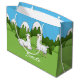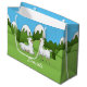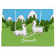 Den här presentpåsen har två söta vita laxar i de sydamerikanska bergen och texten "Grattis på födelsedagen". Texten är anpassade.