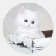 Vit persisk kattunge i grå vit låda på en klisterlapp för kattlover i bakgrunden