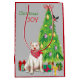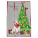 På vardera sidan av den här presentpåsen bär en vit Pit Bull Dog en röd halsduk medan han sitter bredvid Helgdag. Omkring den hund som är lätt inslagen är paket splittrat. En bullfink landar på Julgran. I den röda och grönt texten står det "Jul JOY".