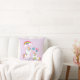 En kudde med vit mamma-enmajs med finare färgad mane och svan. En baby-enhörning som lägger sig bredvid henne, med en grönt nappar i munnen. En färgstark regnbåge med flytande moln och några stjärnor och hjärta dekorerar denna söta och adjektiva design. En fet rosa-kontur som omger bilden ge är en barnlik doodle-vib. Bakgrund till den lätta lila-rosa-pastelltypen färgad. Det skulle se bra ut i ett sovrum i barn.