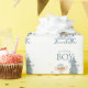 Den här söta anpassningsbarna babyduschen med pappra inslag är en vattenfärgsbild av vedlandet stil. En bild av en hannfawn, eller baby hjort, trycks i mitten, intill gräs träd och faller blå snö.